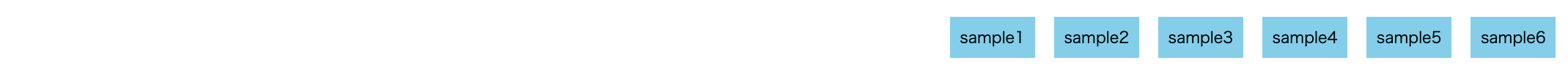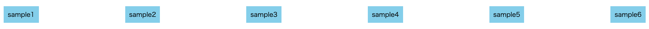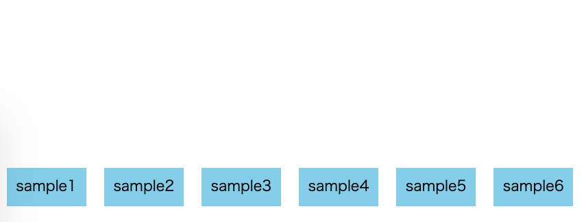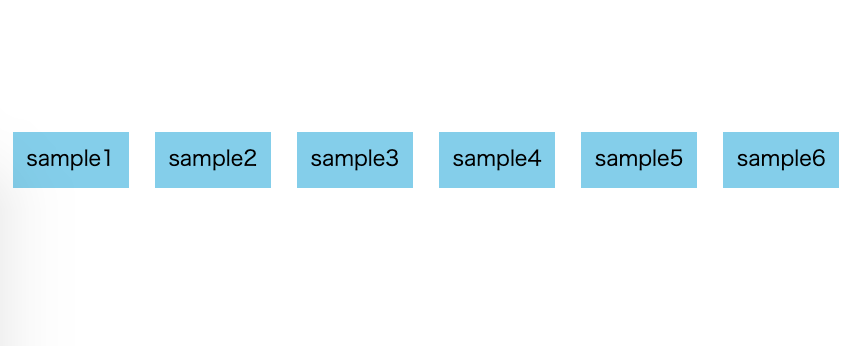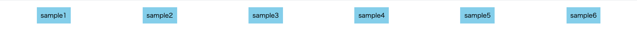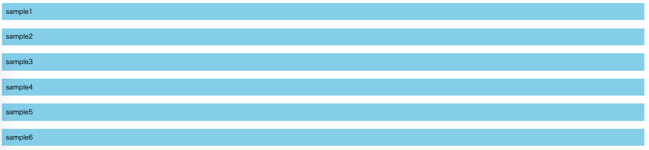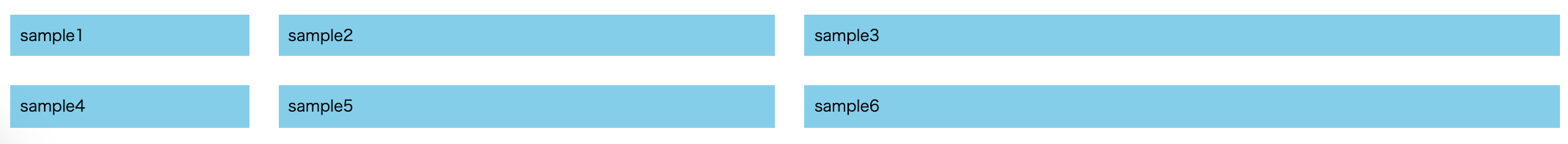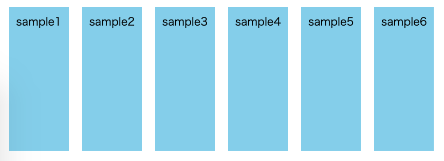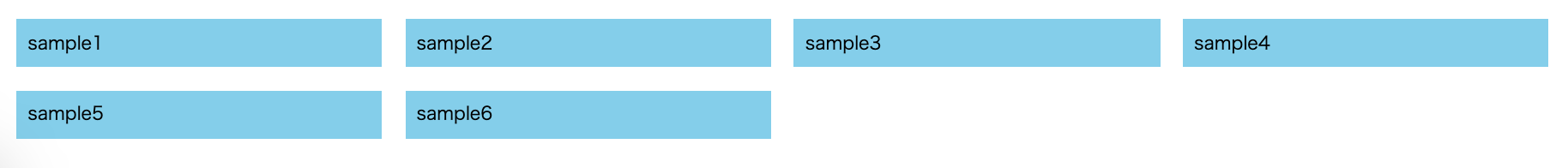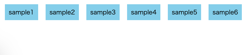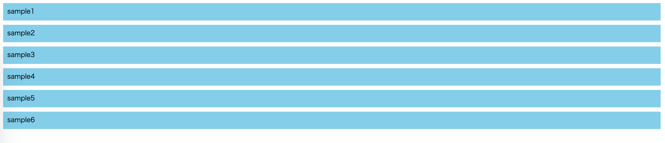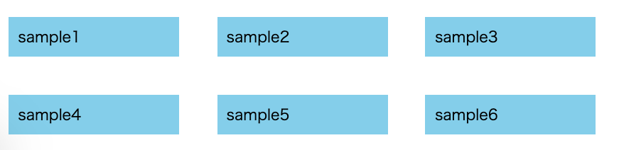 <divclass="container"><divclass="sample">sample1</div><divclass="sample">sample2</div><divclass="sample">sample3</div><divclass="sample">sample4</div><divclass="sample">sample5</div><divclass="sample">sample6</div></div>.sample{background:skyblue;margin:10px;padding:10px;}結果。